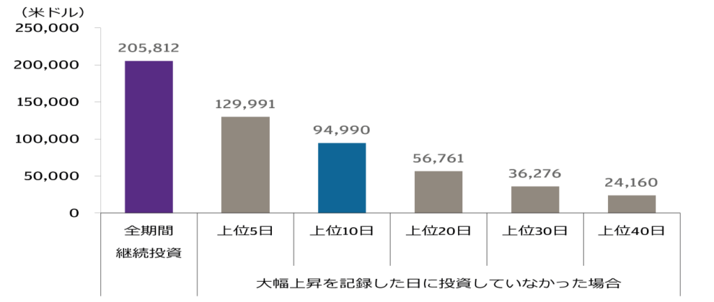 下は、米国株式の大幅上昇日を逃した場合のトータルリターンを表したグラフです。
