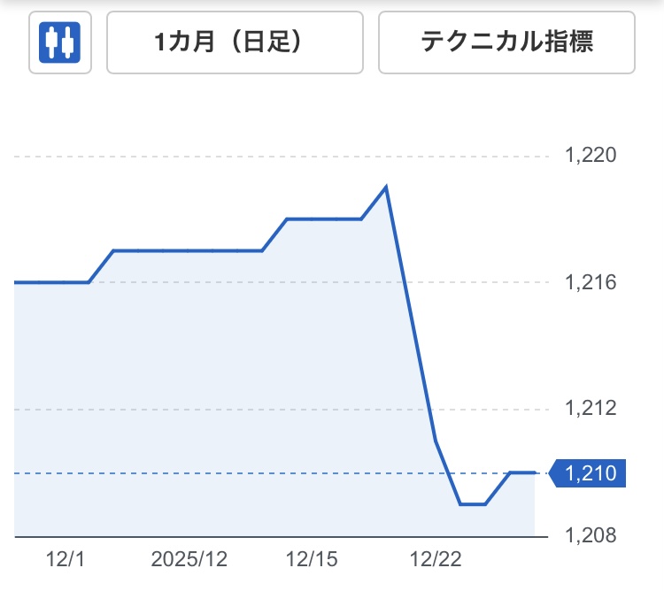 最初はTOB価格の1220円より5円ほど安い1215円付近で推移していたのですが、12/22のTOB期限が近くなるにつれて、少しずつ株価が上がっています。